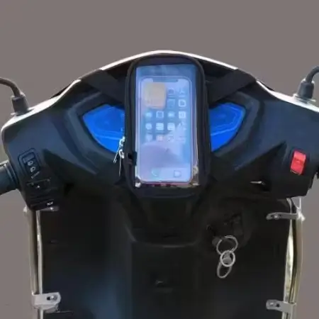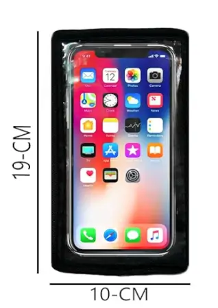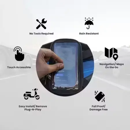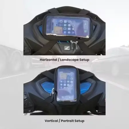 Rain-resistant mobile holder pouch for scooters and bikes with adjustable clip mount, providing secure navigation and visibility while riding.