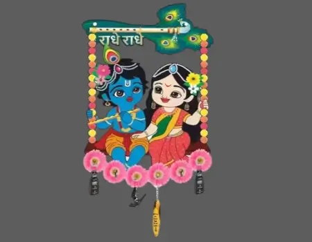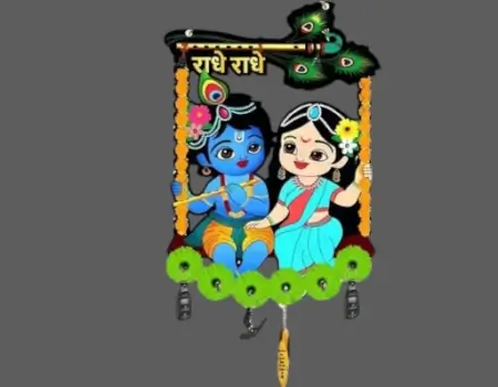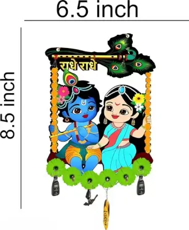 Spiritual 2-piece wooden wall key holder set with Radhe Radhe Krishna theme and peacock feather motifs. Combines devotion and function in one beautiful piece.